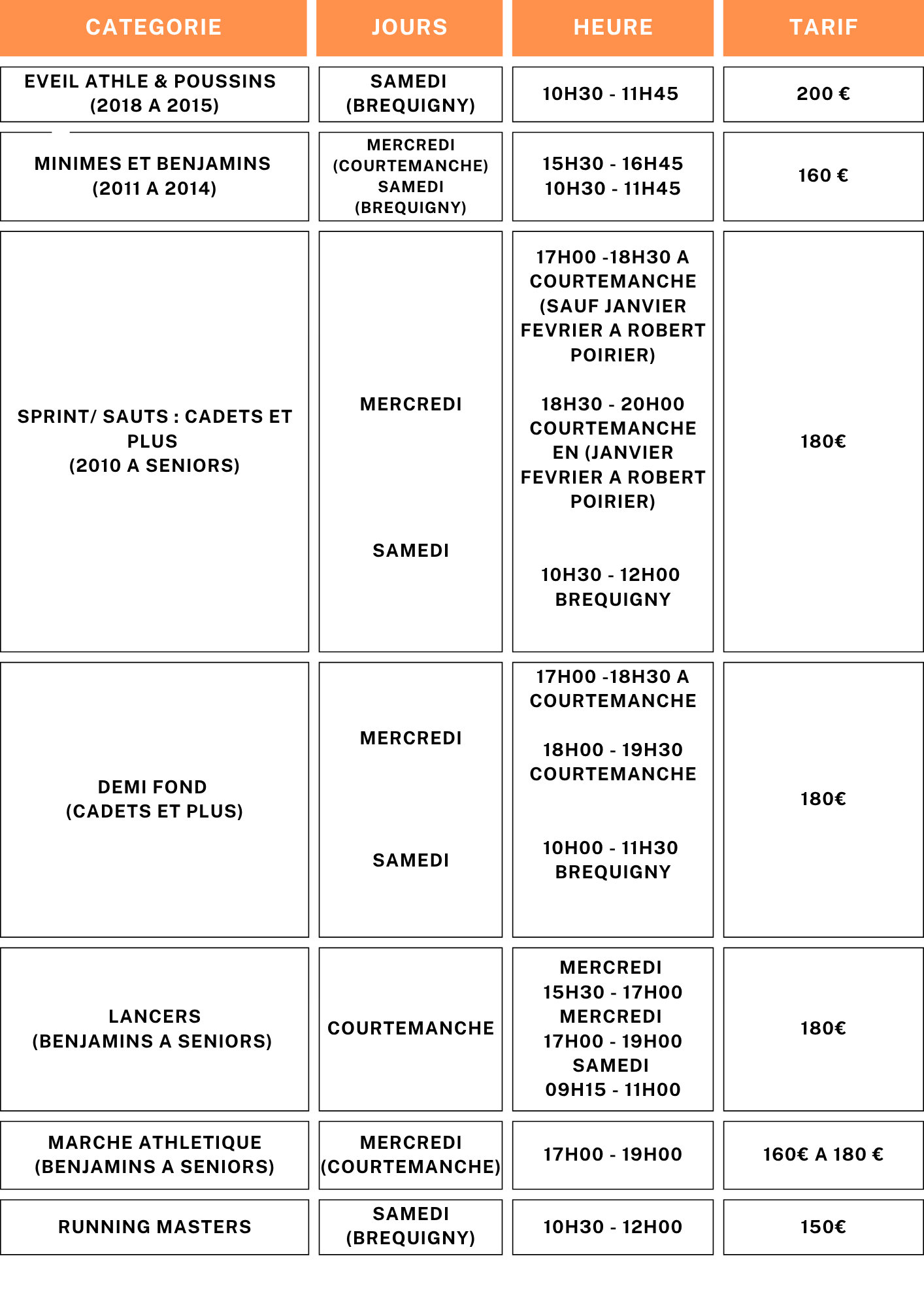Lundi : Courtemanche (Avril à Octobre) Lycée St Vincent (Novembre à Mars) Mardi : Lycée St Vincent Mercredi : Courtemanche ou Stade Robert Poirier Jeudi : Lycée St Vincent Samedi : Bréquigny