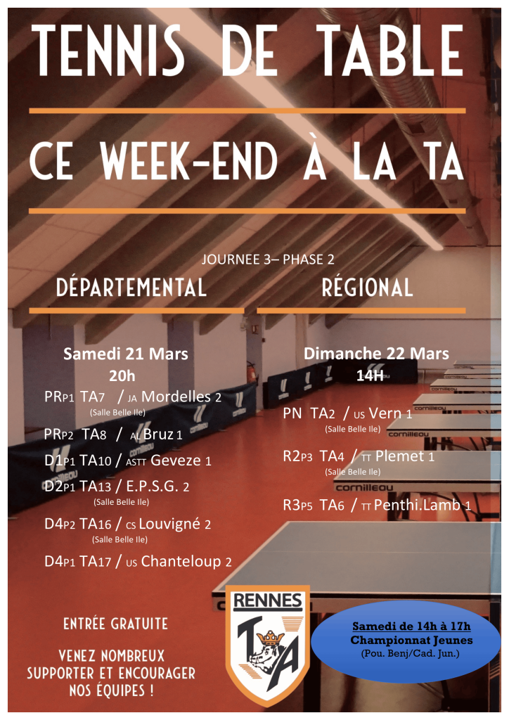 Retrouvez les rencontres du week-end en Tennis de Table le samedi 21 et dimanche 22 mars prochain en Tennis de Table.